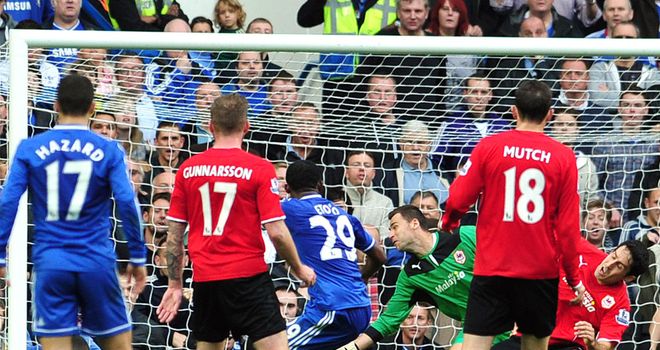 dink over the onrushing Petr Cech.Chelsea levelled in bizarre circumstances on 33 minutes, with Eto'o nicking the ball off Cardiff goalkeeper David Marshall as he bounced it inside his penalty area - in what appeared to be a clear breach of FIFA rules.